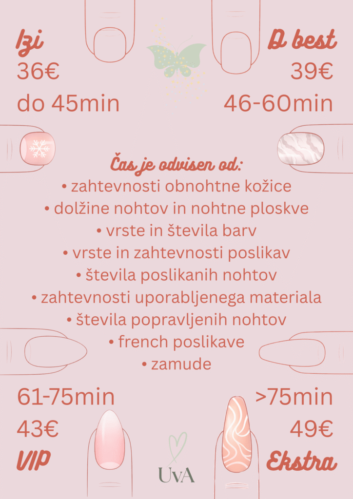 Tretma se lahko od termina do termina razlikuje, saj enkrat izberete french dizajn, naslednjic imate polomljen nohtek, spet tretjič si zaželite samo kratke natur nohtke. Zato cena lahko varita glede na čas tretmaja.